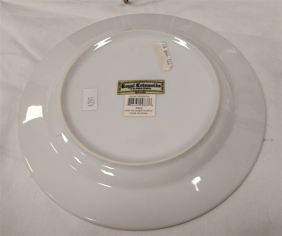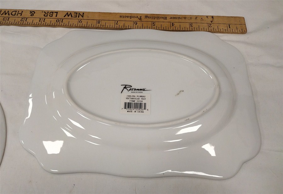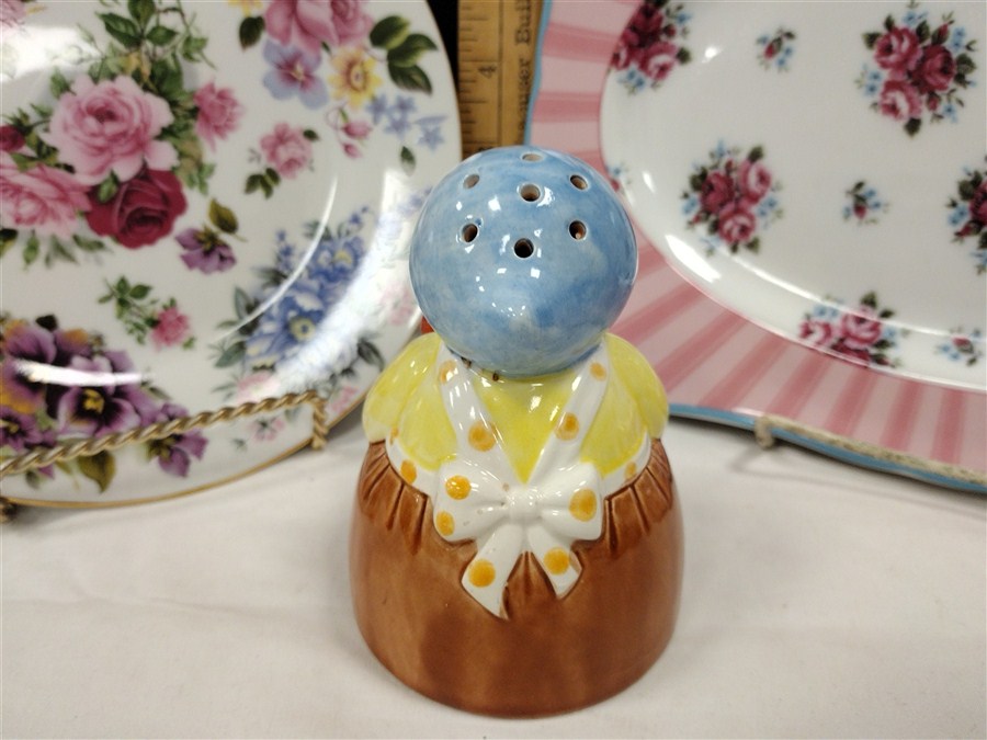 TWO PORCELAIN PLATES AND JOSEF ORIGINALS SUGAR SHAKER. ONE PLATE IS ROYAL COTSWOLD, ENGLAND & THE OTHER IS ROSANNA. NO STOPPER IN SHAKER