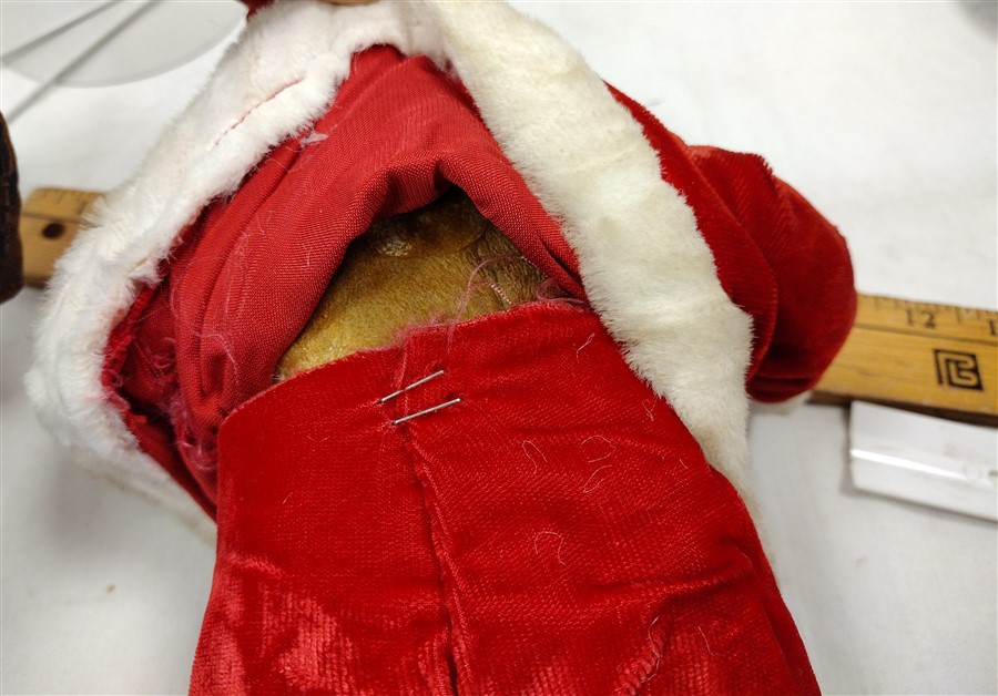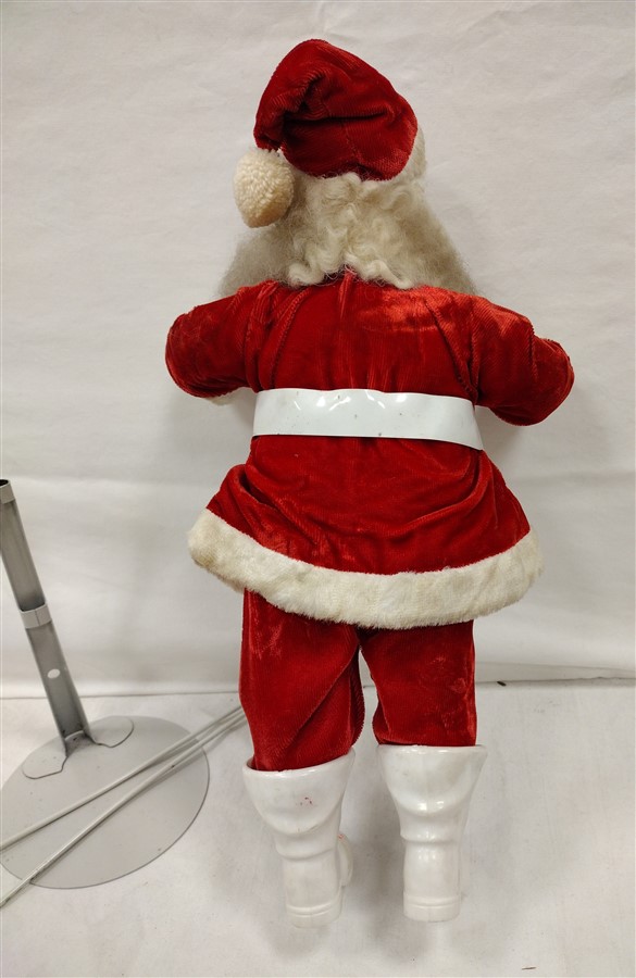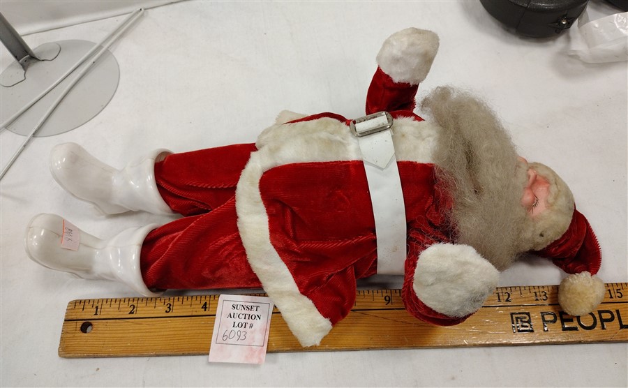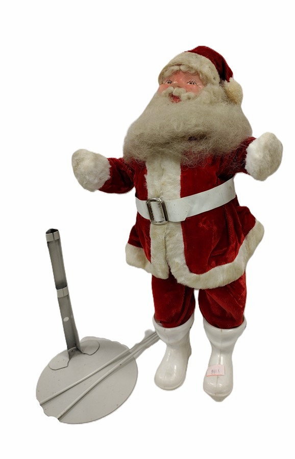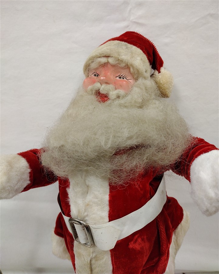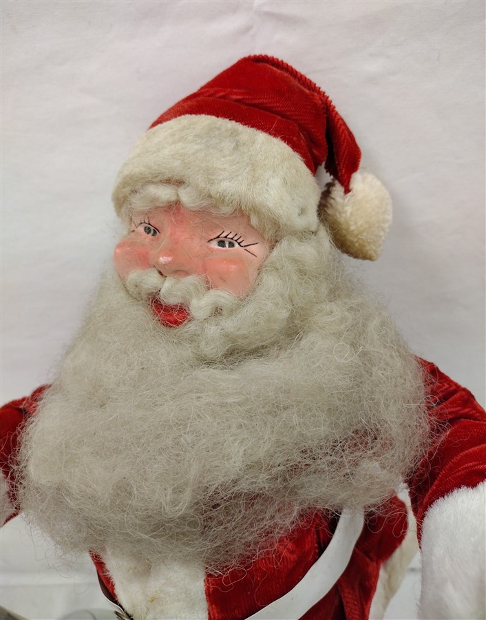VINTAGE FOAM BODY SANTA DOLL WITH MOLDED PLASTIC FACE, PLASTIC BOOTS. CLOTHING ATTACHED. BEARD GRAYED FROM AGE
