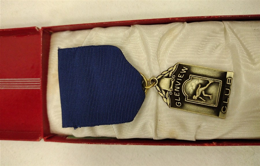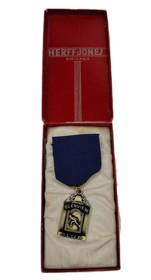 HERFF-JONES BADGE, GLENVIEW CLUB ICE SKATING. ORGINAL VINTAGE BOX
