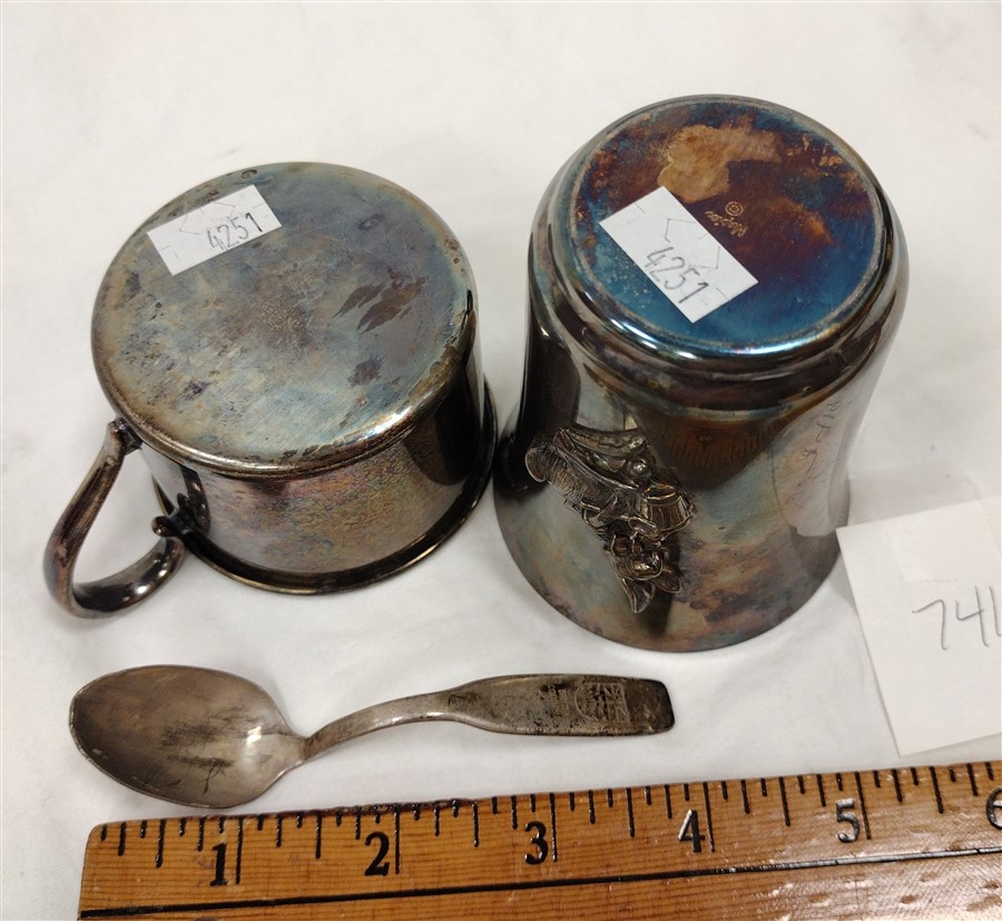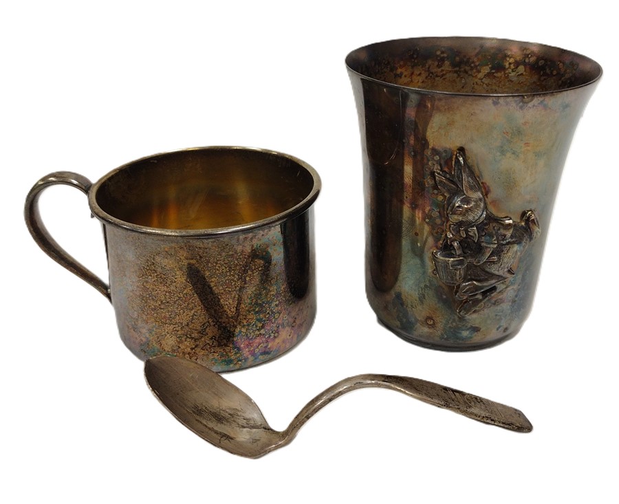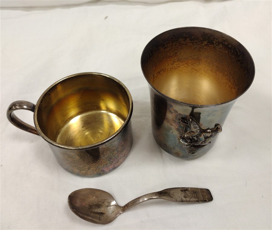 TWO SILVERPLATED BABY CUPS AND AS IS SPOON