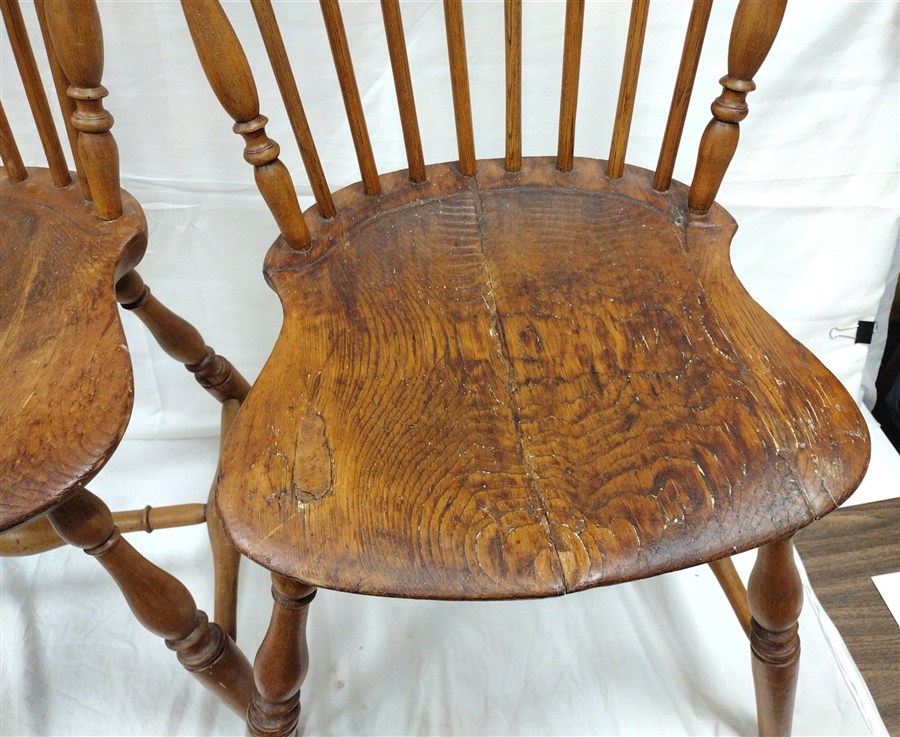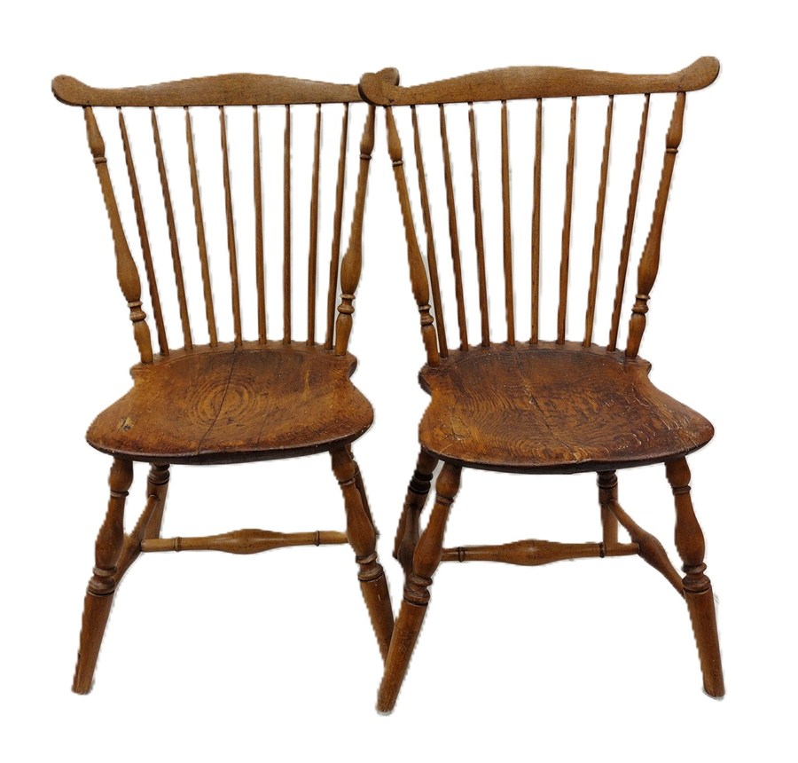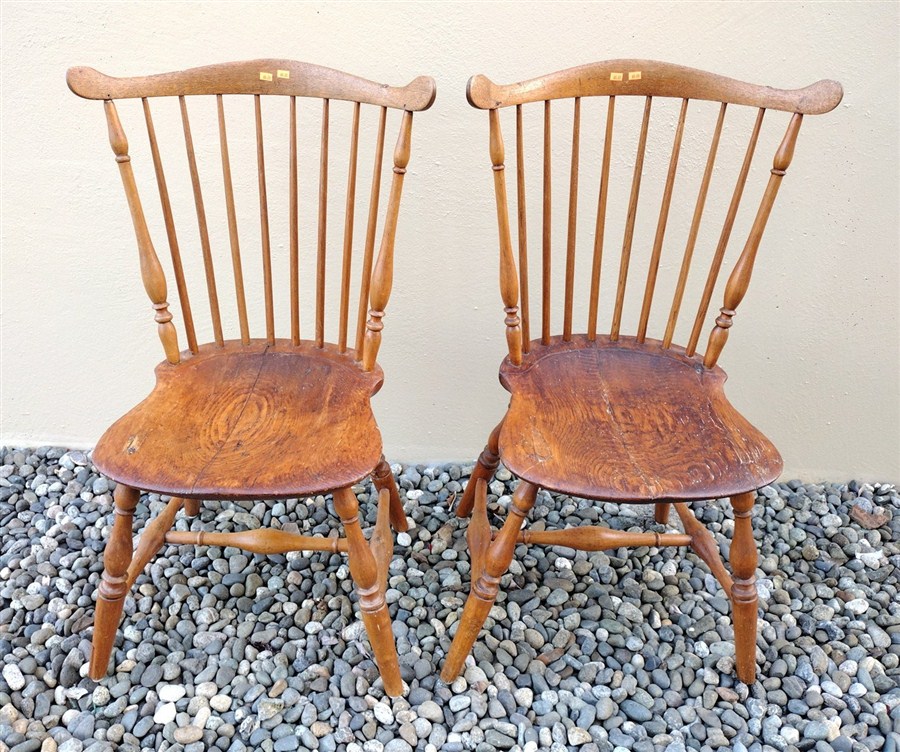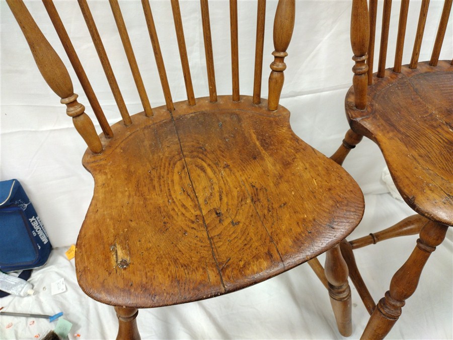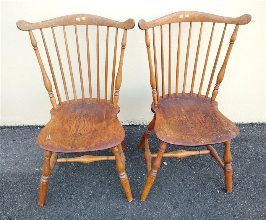 A PAIR OF LATE-18TH -EARLY 19TH C WINDSOR CHAIRS. FROM AN AMERICAN EAST COAST ESTATE. AT SOME POINT IN THEIR LONG HISTORY THE PAINT HAS BEEN STRIPPED AND REFINISHED. LOTS OF INTERESTING OLD REPAIRS. DUE TO AGE, BEST USED AS DISPLAY PIECES