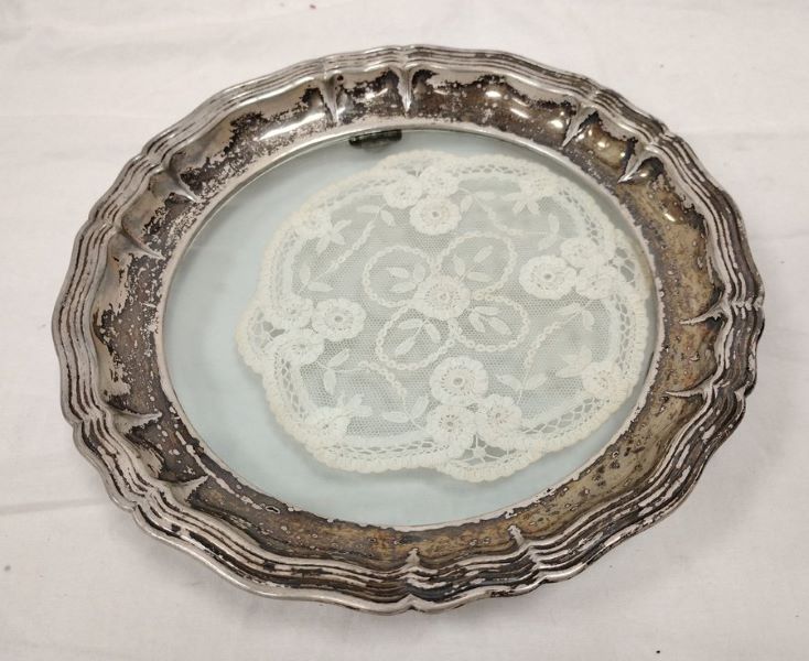 DOILIE IN ANTIQUE SILVER PLATED GLASS TRAY