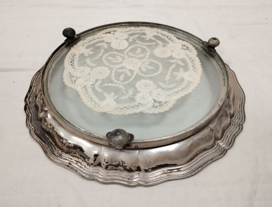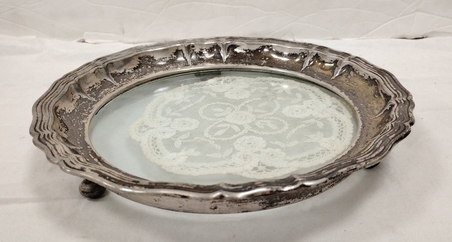 DOILY IN SILVER PLATED GLASS BOTTOM TRAY. STAMPED B.E.P.W.A. 5032. 9 INCHES