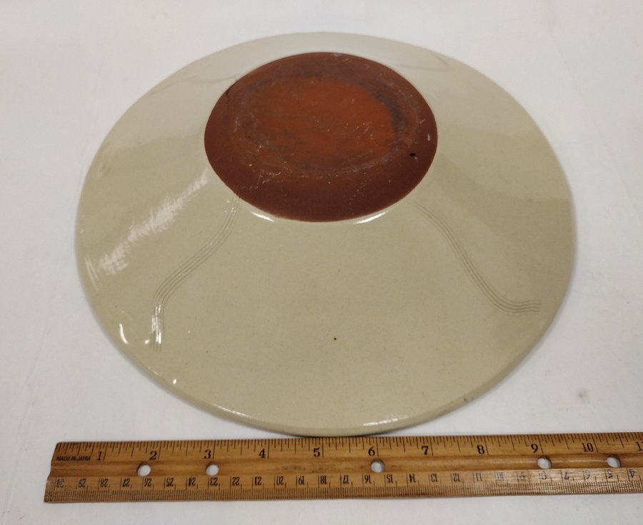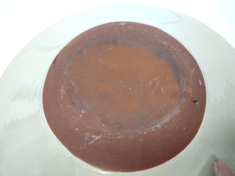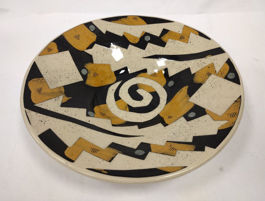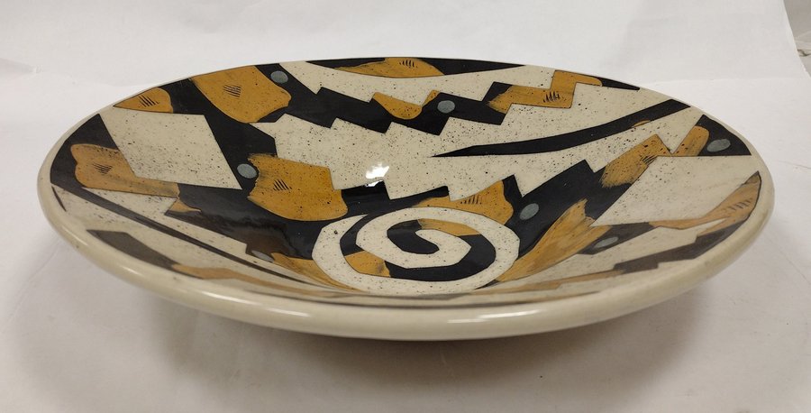 SIGNED TERRACOTTA STUDIO POTTERY BOWL WITH MODERN NATIVE MOTIF. 12" DIAMETER